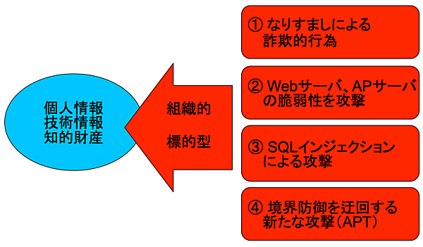 - Webサーバ、APサーバの脆弱性を攻撃し、サーバへ侵入してデータベースを直接攻撃