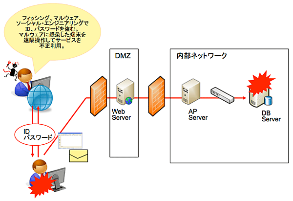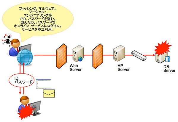 フィッシング、マルウェア、ソーシャル・エンジニアリング等でID、パスワードを盗み、盗んだID、パスワードでオンライン・サービスにログインしてサービスを不正利用するシナリオです。最近では、金融機関の正規のオンライン・バンキングにログイン直後に暗証番号や契約者情報を入力させる偽画面を表示させ、そこで入力された情報が盗み取られるという事例が報告されています。