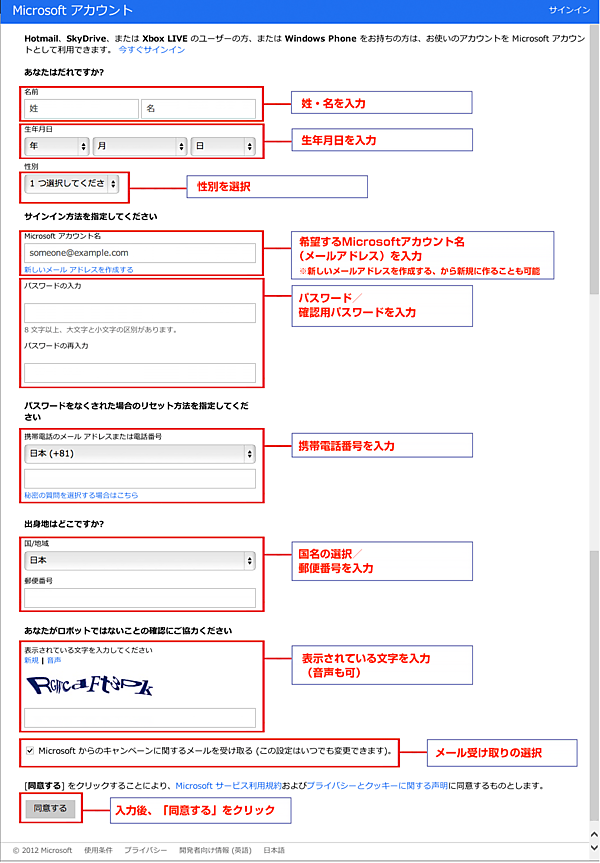 ページの中ほどにある「Microsoftアカウントに登録しよう」をクリックすると、登録画面に進みますので、ここで必要事項を入力して、「同意する」ボタンをクリックします。
