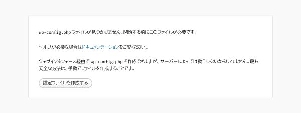 今回は設定ファイルが作成されていないので、wp-config.phpがないという画面が表示されます。設定ファイルを作成するボタンをクリックしてください。