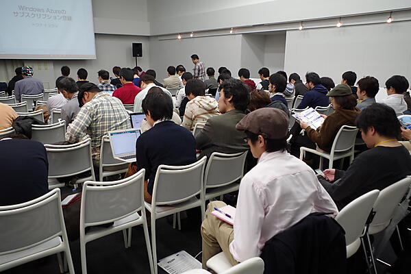 セッション後は、登壇者などを囲んだ親睦会を開催。Azureのユーザー会である「Japan Windows Azure User Group」事務局の冨田氏なども参加し、参加者からの個別の質問に答えていた。飛び入りでデモを実施する参加者が見られるなど、大いに盛り上がっていた。一方、チームメンバーが決まってない参加者がメンバーを探す「リアルAzureの酒場」も実施。まだメンバーの決まっていない参加者がチーム作りに奔走していた。