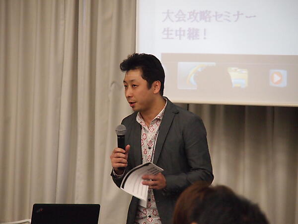最初に登壇したごはん大好き氏は、大会の概要を紹介。参加ルールや賞品などを説明するとともに、女性の参加を強く呼びかけた。女性が所属するチームのポイントは2倍になる、女性向けの賞品を用意するといったメリットに触れ、女性参加者に向けてエールを送った。