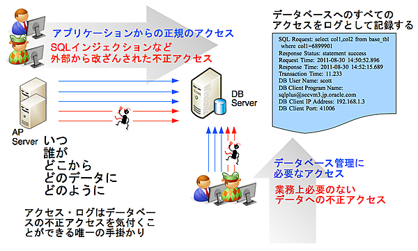 データベースのアクセス・ログは、データベースに不正アクセスがあったのか、なかったのかを確認する唯一の手がかりです。アクセス・ログを取得していなければ、情報漏えいがあったとしても、どのようなSQLで情報が持ち出されたのか、何件の情報漏えいがあったのかを特定することができません。被害総額もあくまで「可能性」ということで試算するため高額となるケースがあります。また、仮にデータベースからの情報漏えいでなかったとしてもそれを証明することができません。このため、正規、不正規を問わず、以下の観点でデータベースへのアクセス・ログをすべて漏らさず取得する必要があります。