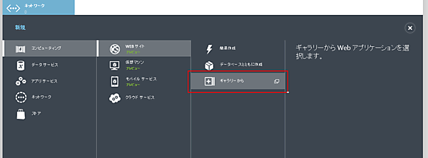 Windows Azure管理ポータルのコマンドバーにある[新規]をクリックして、[コンピューティング]-[WEBサイト]-[ギャラリーから]を選択し、Azure向けアプリの検索を表示します。