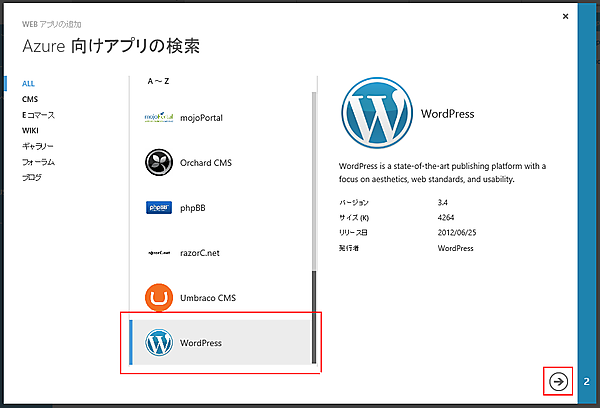 インストールするアプリケーションを選択します。今回は、[WordPress]を選択し、右下の矢印アイコンをクリックします。