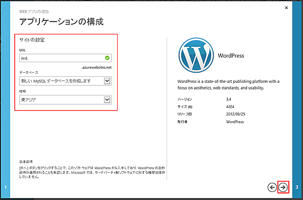 WordPressの設定を行います。URL、データベース、地域を設定し、右下の矢印アイコンをクリックします。