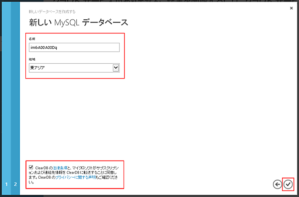 MySQLデータベースを作成します。地域は先ほど設定した場所を選択してください。また、今回使用するMySQLデータベースはClearDB が提供しているサービスとなりますので、ClearDB の使用許諾に同意の上チェックを入れて、右下のチェックマークをクリックします。