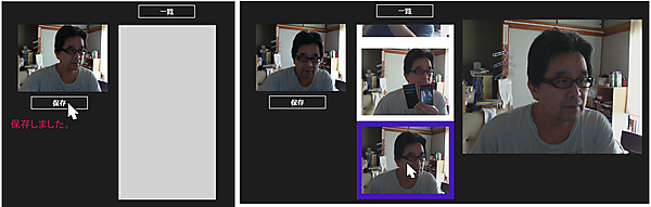画面にはWebカメラの画像が表示されています。自分の好きなポーズで[保存]ボタンをタップすると、そのポーズが保存されます。[一覧]ボタンをタップすると、撮ったポーズの画像が表示されます。
