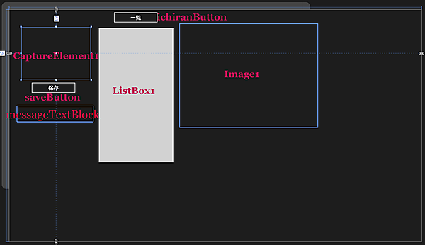 ツールボックスからデザイン画面上にCaptureElementコントロールを1個、「保存」と「一覧」用のButtonコントロールを2個、ListBoxコントロール1個、Imageコントロールを1個配置します(図5)。CaptureElementコントロールは、カメラや web カメラなどのキャプチャ デバイスからのストリームをレンダリングするコントロールです。