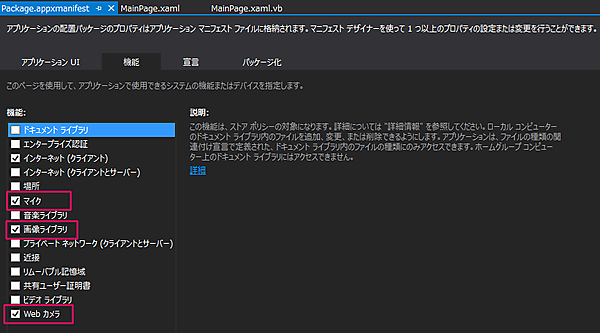 ソリューションエクスプローラー内のpackage.appxmanifestファイルをダブルクリックして開き、「機能」タブをから、「マイク」、「画像ライブラリ」、「Webカメラ」にチェックを付けて、アクセス可能にしておきます(図6)。