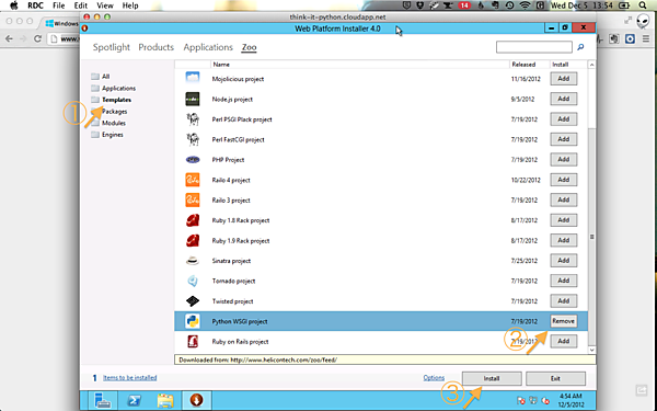 Web Platform Installer 4.0のパッケージのインストール画面に戻るので、今度は左のメニューのTemplatesを選択し、Python WSGI projectのAddボタンをクリックします。その後、Installボタンをクリックします。