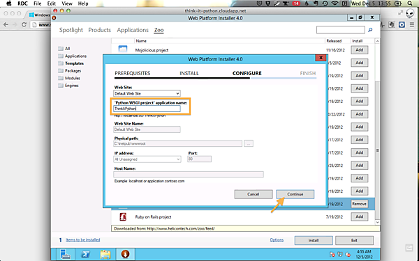 'Python WSGI project' application nameを入力し、Continueボタンをクリックします。この例ではThinkItPythonとしました。