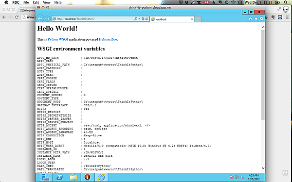 そうすると、自動でWSGIのテンプレートが作成され、アプリケーション・サーバが立ち上がります。更に確認のためにIEが自動で起動します。Hello World!が無事にWSGIサーバが立ち上がった証拠です。