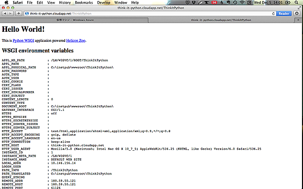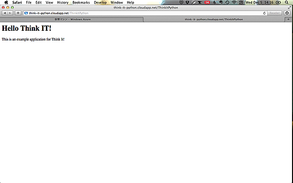Azureのポータルを表示しているブラウザを使って、立ち上げたサーバにアクセスします。アドレスはhttp://[ドメイン名]/[アプリケーション名]です。そうすると、先程、Windows Server側のIEで確認したHello World!ページが表示されます。
