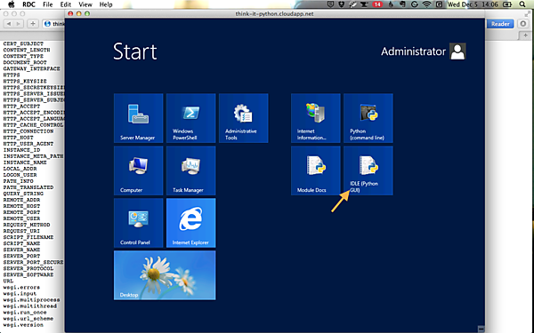 これだけでは自分でカスタマイズ出来ないので、最後にページの内容を変更してみます。リモートデスクトップに戻り、Windows Serverのスタート画面を開き、IDLE (Python GUI)をクリックします。