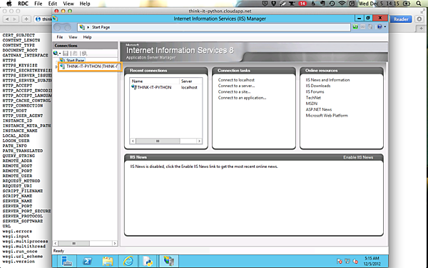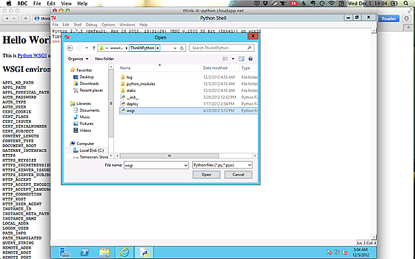 IDLEが開くので、メニューからFile > Openを選択します。するとファイル選択画面が表示されるので、そこで C:\inetpub\wwwroot\ThinkItPython\wsgi.py を選択し、OKボタンを押します。