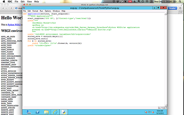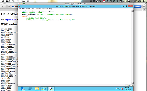 wsgi.pyの内容が表示されます。これが先ほどのHello World!ページのコードです。これをHello Think It!に書き換えて、保存します。