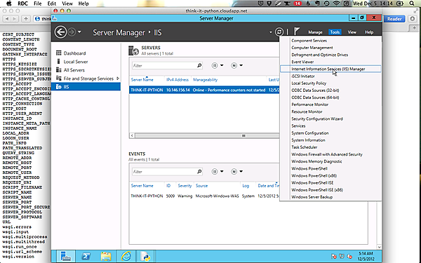 IDLEを閉じ、Server Managerを開きます。右上のメニューから、Tools > Internet Information Services (IIS) Managerを選択します。