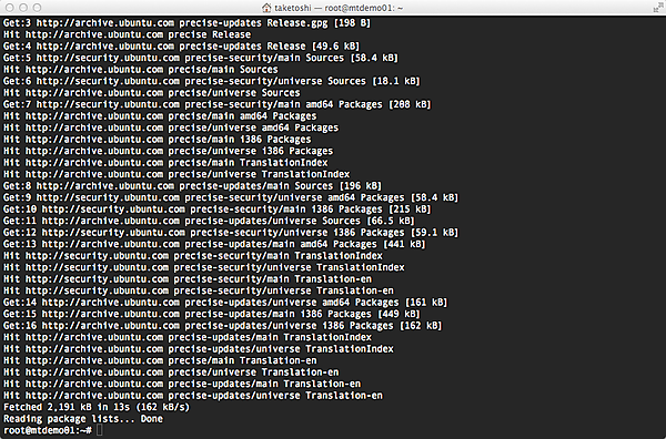 次に、apt-getコマンドを使い、パッケージリストを更新します。