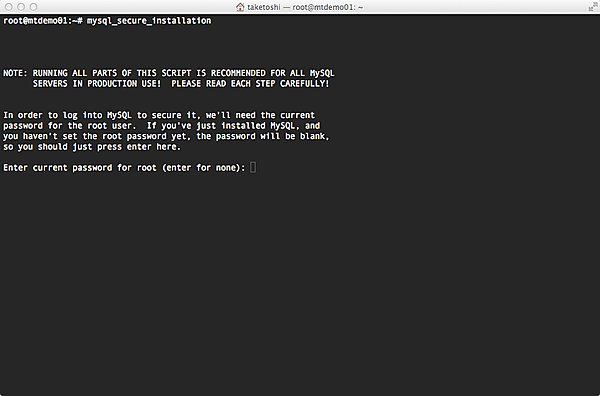 最初にmysql_secure_installationコマンドを実行し、セキュリティを強化します。