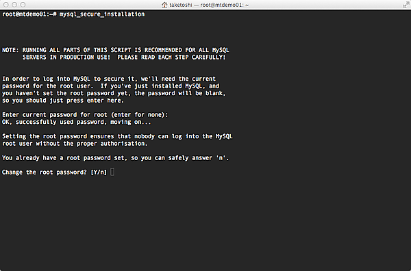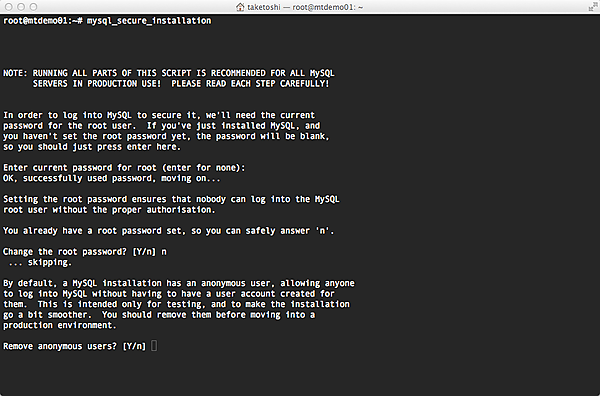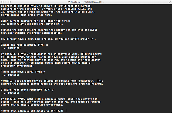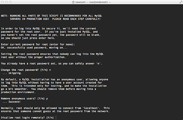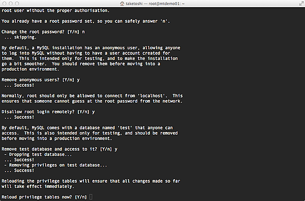 rootアカウントからのアクセスをローカルホストに限定するか確認メッセージが表示されます。ネットワーク経由からのアクセスを防止するために、yと入力してください。