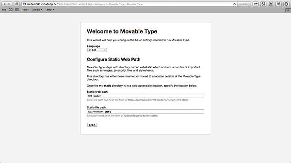 CSSやJavaScript等のスタティックファイルの場所を指定します。指定した後に「Begin」ボタンをクリックしてください。