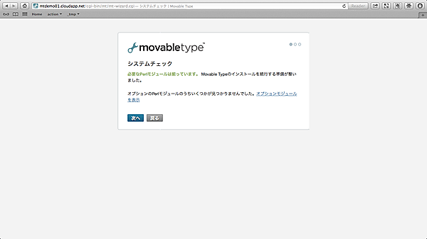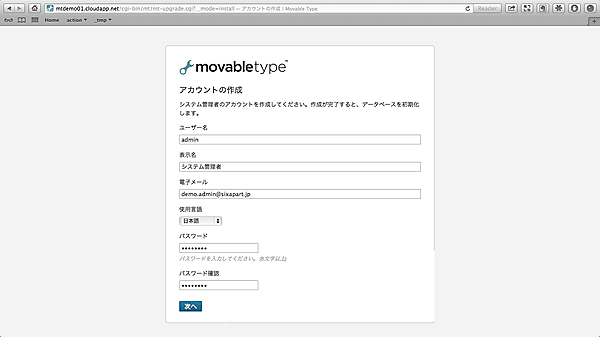 「Movable Typeの設定が完了しました」というメッセージが表示されます。ここまでで、基本設定は完了しました。「次へ」ボタンをクリックし、システム管理者を登録します。