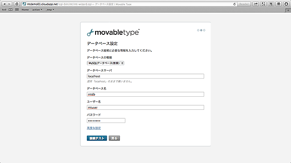「データベース設定」画面が表示されます。さきほど作成したデータベース名やアカウント情報を入力し、「接続テスト」ボタンをクリックします。