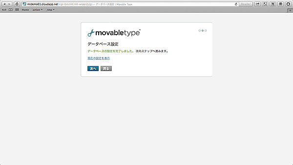 「データベースの設定を完了しました」というメッセージが表示されていることを確認した上で、「次へ」ボタンをクリックします。