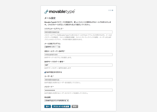 「メール設定」画面が表示されます。MTOSの最新版では、SMTPAuthに対応するだけではなく、SSLやSTARTTLSに対応しているため、メールサーバーを新規に導入する必要はありません。設定した後に「テストメールを送信」ボタンをクリックしましょう。