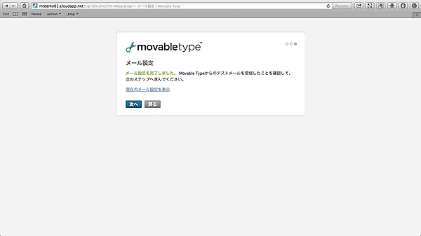 問題なく送信できると、「メール設定を完了しました」メッセージが表示されます。確認した上で、「次へ」ボタンをクリックします。