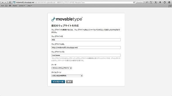「最初のウェブサイトを作成」画面が表示されます。以下の情報を入力した後に、「インストール」ボタンをクリックします。