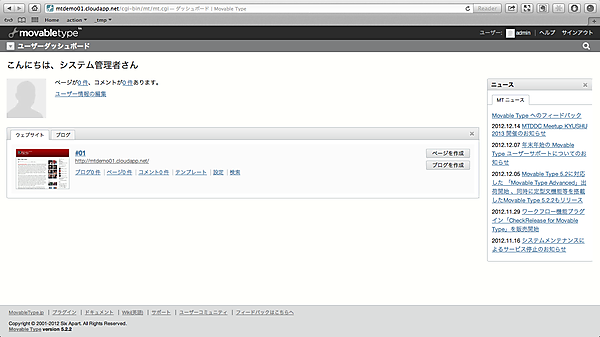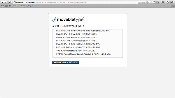 「インストール」画面が表示され、最後に「Movable Typeにサインイン」ボタンが表示されます。このボタンをクリックしてください。