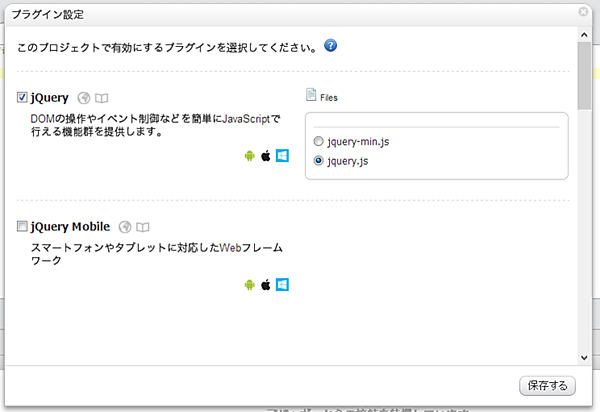 【画面2:MonacaプラグインでjQueryを有効にする】
