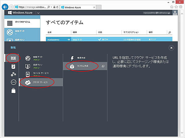 5. [コンピューティング] – [クラウド サービス] – [カスタム作成]とクリックします。