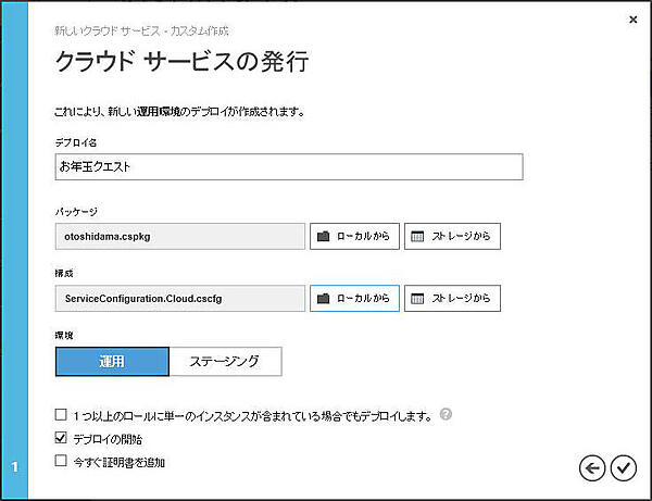 7. 「クラウド サービスの発行」ページで以下を入力して確定するため(レ)ボタンをクリックします。