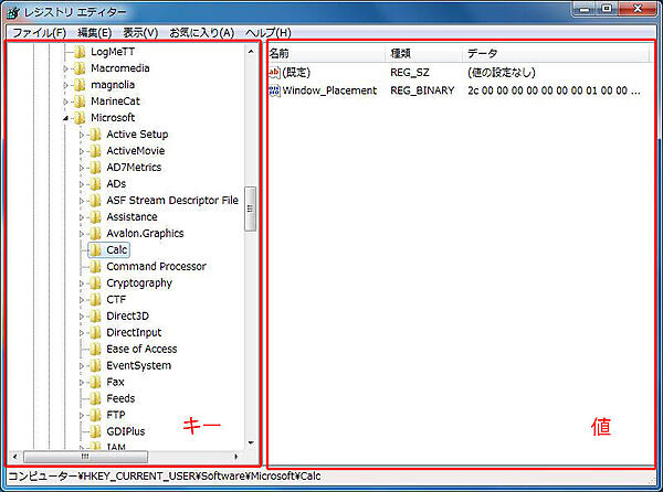 のように表現する。上記の例は、「Windows_Placement」という値に至るまでのキーの構成を表している。レジストリ内のキーと値の関係は、フォルダーとファイルの関係に置き換えて考えると分かりやすいだろう。
