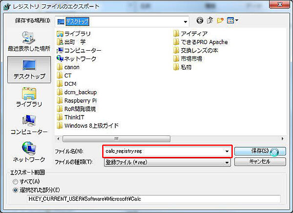 レジストリを編集する前には、編集するキーをファイルとして必ずバックアップしておこう。キーをバックアップするには、まずレジストリエディターのツリーからバックアップしたいキーを右クリックし、表示されたメニューから[エクスポート]を選択する。「レジストリファイルのエクスポート」というダイアログが表示されるので、テキストボックスにファイル名を入力して[保存]ボタンをクリックする。これで、指定したレジストリキー以下の値すべてが「登録ファイル」(拡張子reg)として保存される。