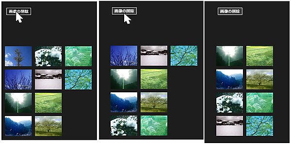 このサンプルは、3列で表示されている画像を、[画像の削除]ボタンで順次削除していきます。すると画像が自動的に並び変わるといったサンプルです(図4)。