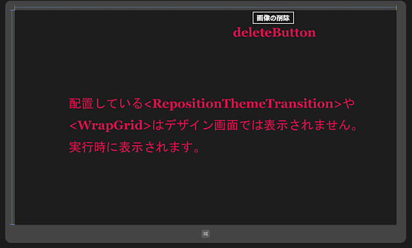 <Button Content="画像の削除" x:Name="deleteButton" FontFamily="Meiryo UI" FontSize="24" Margin="849,2,0,717"/>■(1)