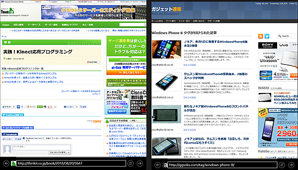 デザイン画面上に配置した2つのWebBrowserコントロールに、左にはThink ITでの筆者の連載記事(2012/08)のページが、右にはWindows Phone 8に関連するページが表示されています(図1)。このWebBrowserコントロールには、「前へ」「戻る」「再読み込み」等の機能が付いており、Windows ストア画面で表示されるInternet Explorer10と同じ作りになっています。