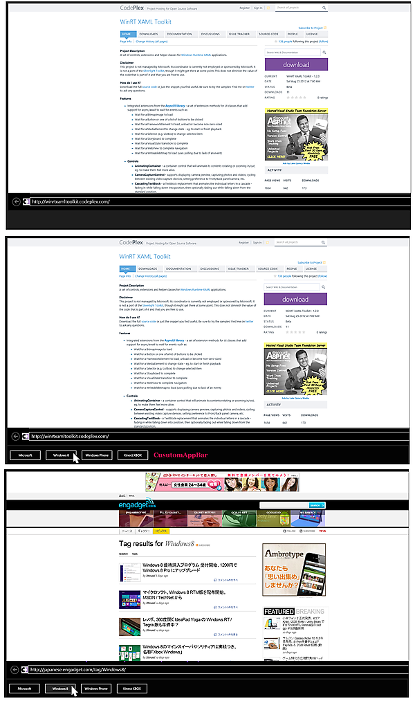 このサンプルは、WebBrowserにサイトが表示されている状態でマウスの右クリックをすると、カスタムアプリケーションバーが表示され、サイト名を書いたボタンが複数表示されます。そのボタンをクリックすると、該当するサイトがWebBrowser内に表示されるというものです(図4)。