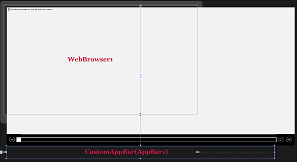 ツールボックスからCustomAppBarとWebBrowserコントロールを、デザイン画面上に配置します。CustomAppBarのWidthに1900、Heightに85と指定していますが、この値は適当に調整してください。