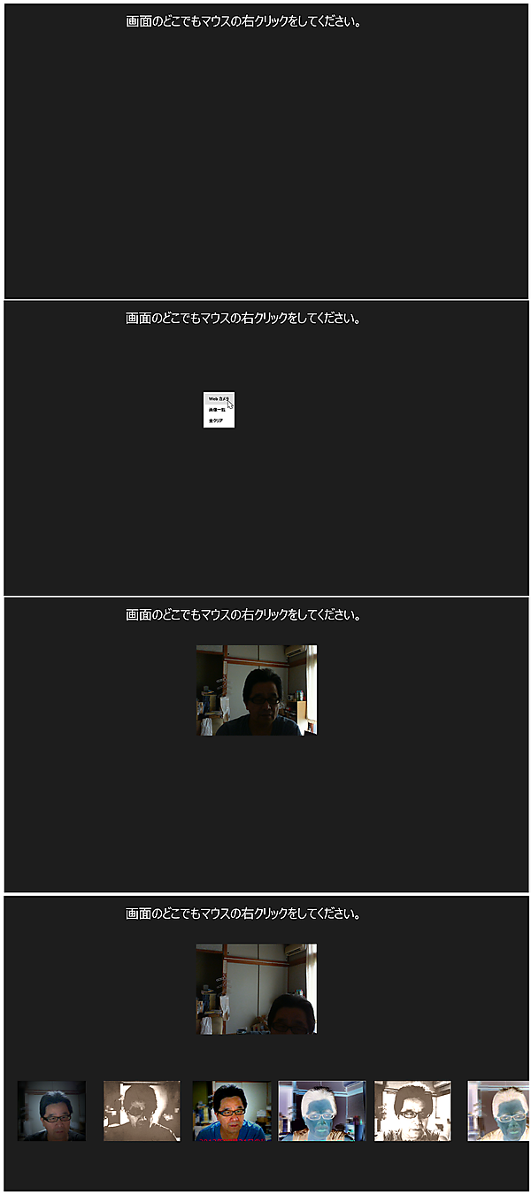今回のサンプルは、ポップアップメニューを使ったサンプルです。画面上でマウスの右クリックをすると、ポップアップメニューが表示されます。中に表示されているメニューを選択すると、Webカメラが起動したり、画像が一覧で表示されたりします(図1)。画像はピクチャライブラリ内の画像を表示していますので、ピクチャライブラリ内に、何枚かの画像を配置しておいてください。
