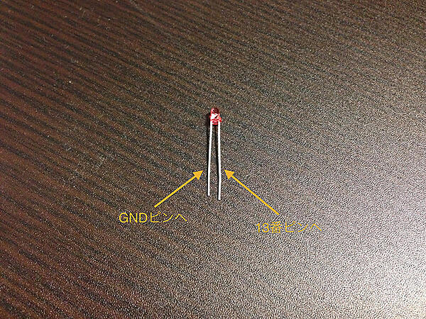 LEDには方向があります。足の長いほうをアノード、足の短いほうをカソードと呼びます。ここでは特にLEDに関して解説しないので、詳しくは検索するなどして調べてください。