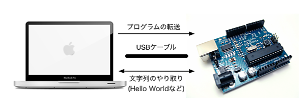 続いて、先ほどのプログラムを解説していきます。まずは、Hello Worldプログラムから解説します。このプログラムを理解するには、ArduinoとPCの関係とArduinoにおけるプログラムの書き方を理解する必要があります。