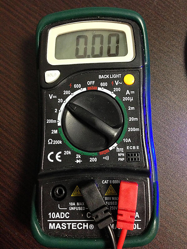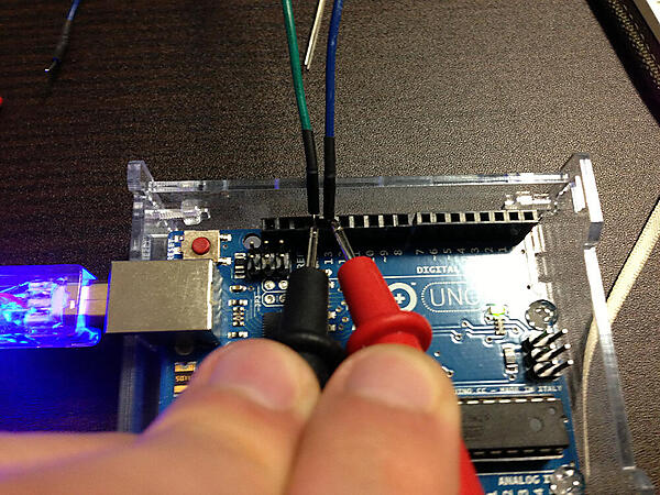 テスターのつまみを20Vに設定し、写真のようにテスターの黒い端子をGNDに、赤い端子を13番ピンに接続します。