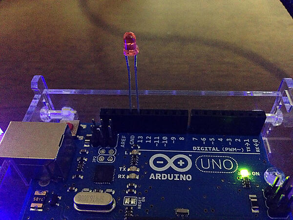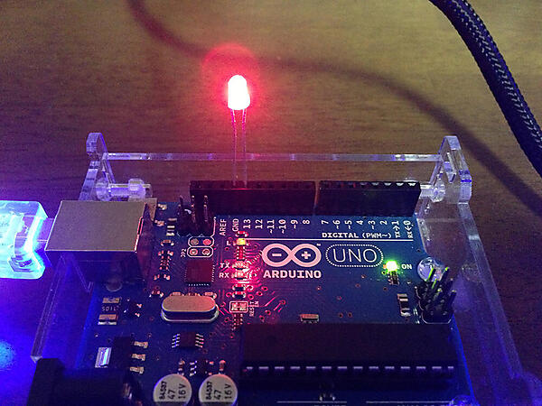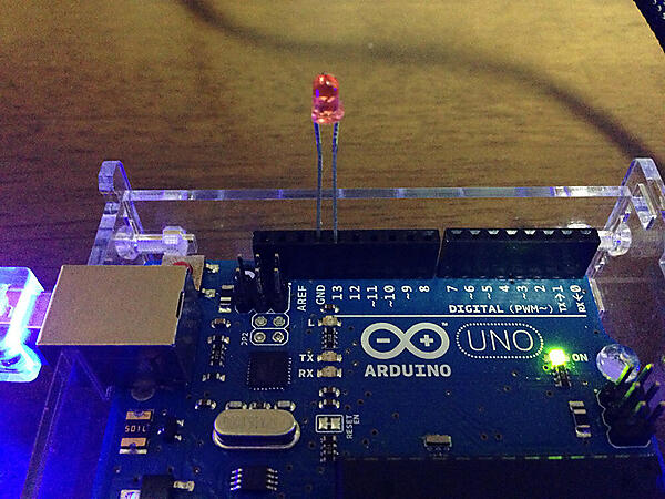 たったこれだけのコードでArduinoに文字を送ることが出来ます。動作確認するためには、LEDが必要です。13番ピンにLEDを取り付けます。前回と同様に足の短い方をGNDに、長い方を13番ピンに接続してください。