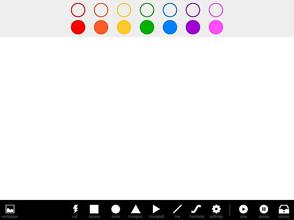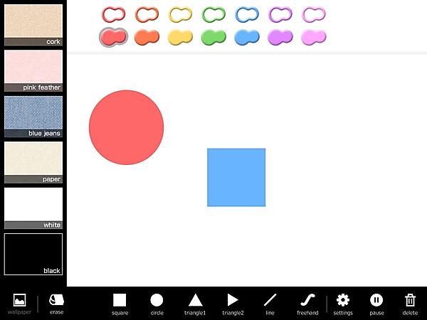 図5:カラーパレットに、山本さんが描いたひょうたん型のアイコンを使用することで、タッチしやすく、見栄えもよくなった。左に並ぶ選択可能な壁紙など、山本さん作のオリジナル素材を全部で30 種類ほど使用している。