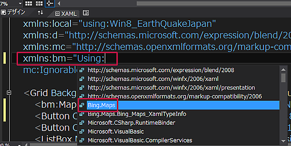 表示されるデザイン画面の要素に名前空間を追加します。xmlns:bm=”Using:と入力すると値の一覧が表示されますので、Bing.Mapsを選択します(図12)。